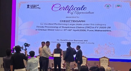 publicuwatch24.-रायपुर। भारत सरकार के राष्ट्रीय स्वास्थ्य प्राधिकरण द्वारा दिनांक 17 एवं 18 अप्रैल 2026 को पुणे (महाराष्ट्र) में आयोजित चिंतन शिविर में देश के सभी राज्यों को योजना के बेहतर क्रियान्वयन हेतु आमंत्रित किया गया। इस अवसर पर छत्तीसगढ़ राज्य को योजना के प्रभावी संचालन, सुदृढ़ प्रशासनिक व्यवस्था तथा पारदर्शी क्लेम प्रबंधन प्रणाली के उत्कृष्ट प्रदर्शन के लिए राष्ट्रीय स्तर पर दो प्रतिष्ठित पुरस्कारों से सम्मानित किया गया।